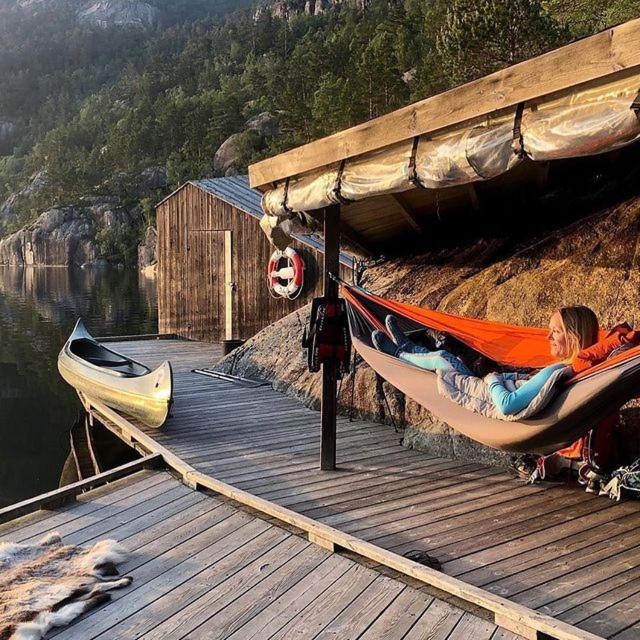 På Preikestolen VannCamp kan du nyte lange dager med aktiviteter på vannet, spise middagen rundt bålet og sove trygt i hengekøyer på brygga under tak. Nyt stillhet, naturen og hverandre. VannCamp ligger en kort padletur fra BaseCampen, så du bor like ved stien til Preikestolen